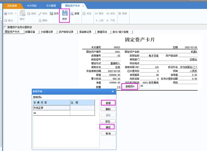1、固定资产-设置-卡片项目中增加自定义项目,设置名称,并选择数据类型;