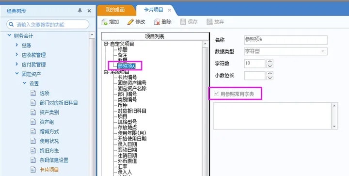 5. 如果需要用参照类型的项目,可以勾选用参照常用字典,在卡片样式添加这个卡片项目,点击这个项目就可以增加参照内容,如图: