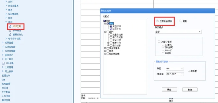 A、 还原缺省模板;适用于在凭证打印或账簿打印的详细格式设置中,将打印参数调整乱了或者模板错乱,可以使用还原缺省模板方式,勾选左边对应凭证,账表,进行恢复来还原系统预置的打印参数