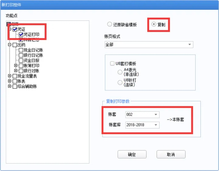 B、 复制;适用于将已经设置好打印的账套打印参数复制到目的账套(未设置打印参数的账套),同样目的账套需要在【总账】-【设置】-【选项】-【账簿】需要勾选使用新打印控件打印,并且该账套的打印类型与被复制账套的打印类型一致(即【总账】-【设置】-【选项】-【账簿】打印类型需要一致)