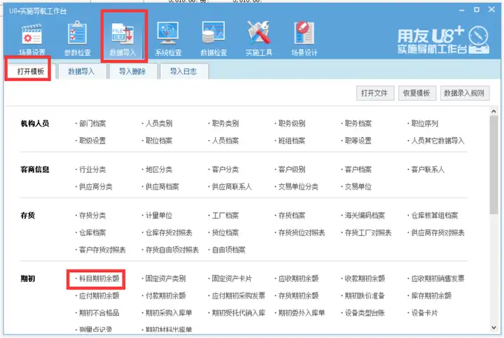 1.打开实施导航-数据导入-打开模板,点开科目期初余额模板