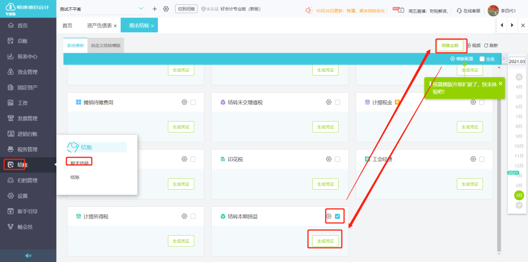 财务软件依次点击【结账】-【期末结转】,勾选对应结转模板,点击【测算金额】后,在【结转损益】方框下点击【生成凭证】即可自动结转生成期间损益结转的凭证,然后点击保存即可。
