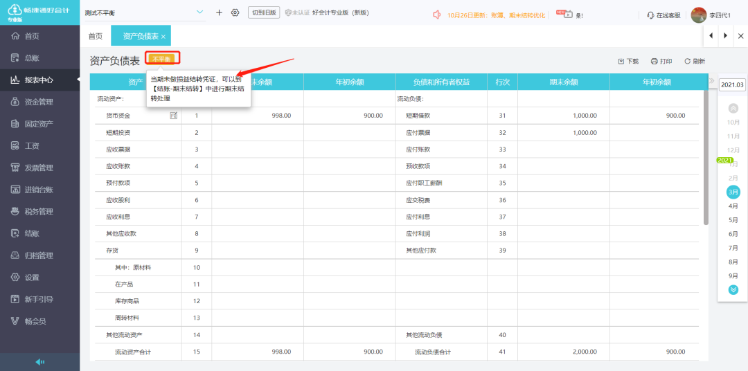 问题现象:结账的时候提示资产负债表不平衡,到报表中心点击不平衡提示【当期末做损益结转凭证,可以到【结转-期末结转】中进行期末结转处理】