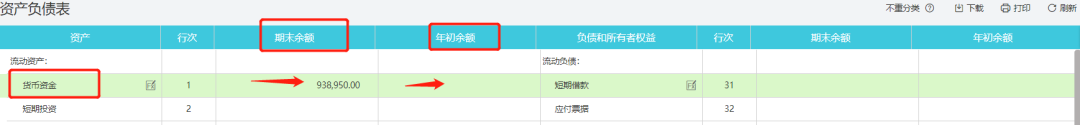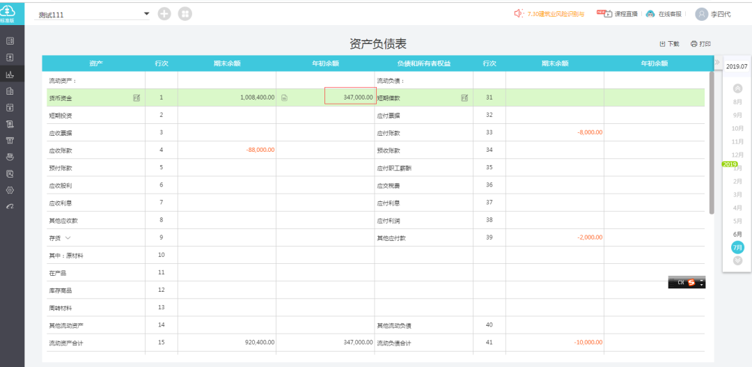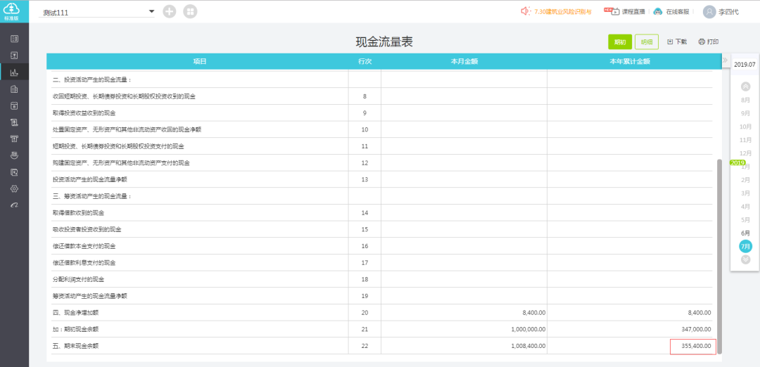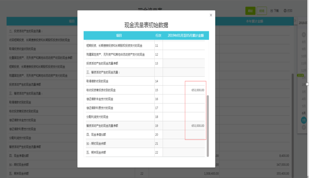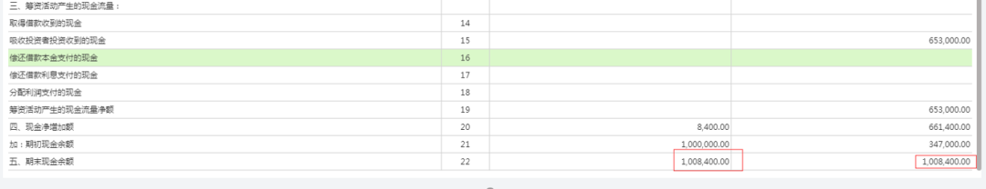 如下图:年中建立财务软件的账套,未录入期初现金流量,导致本年累计金额期末现金余额与本月金额的期末现金余额差期初的金额653000元(勾稽关系:=1008400-355400)