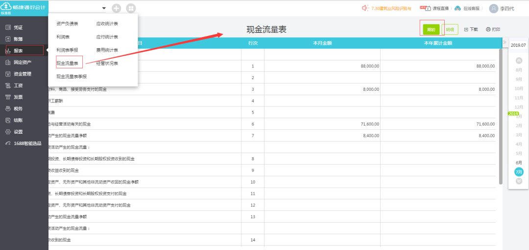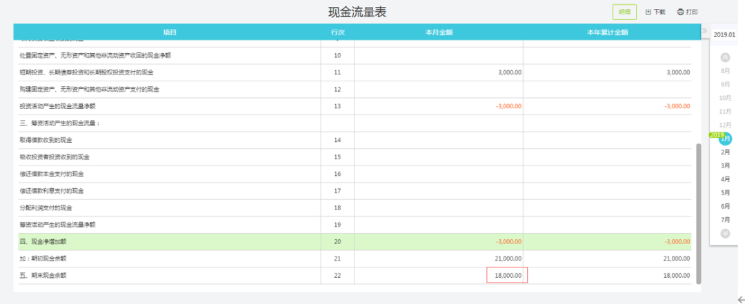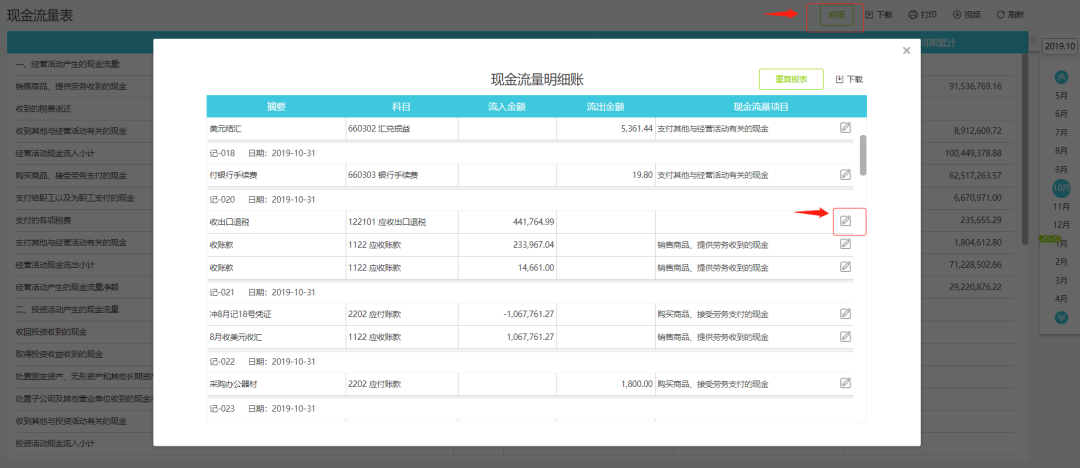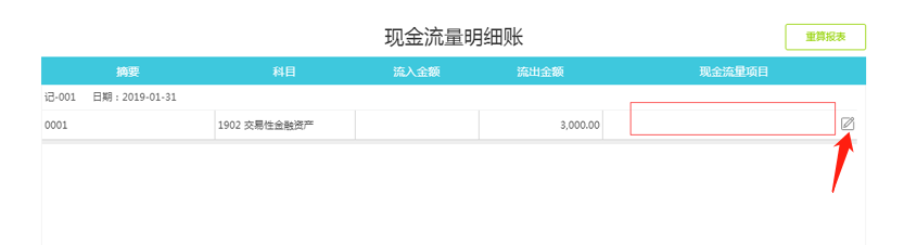 ②点开右上角“明细”,仔细查看该月现金流量项目这列中是否存在空白流量项目,把空白的点击小笔选择项目据实补填上即可。