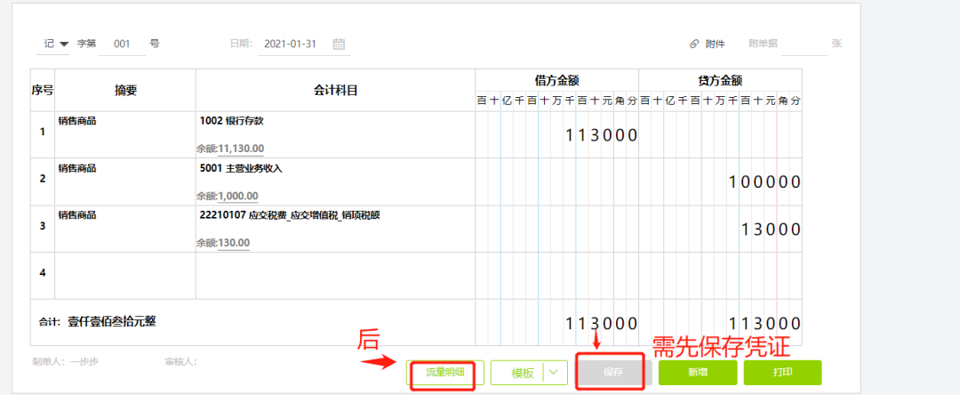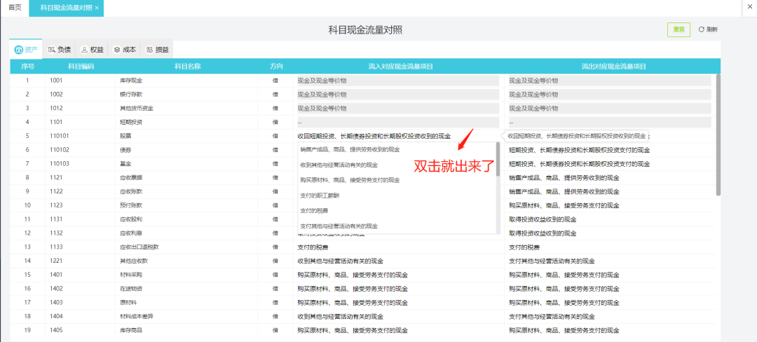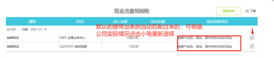 做完账保存后,点击【明细】即可以根据自己的实际情况重新选择流量项目,默认带出是系统科目对照表自动匹配出的项目。