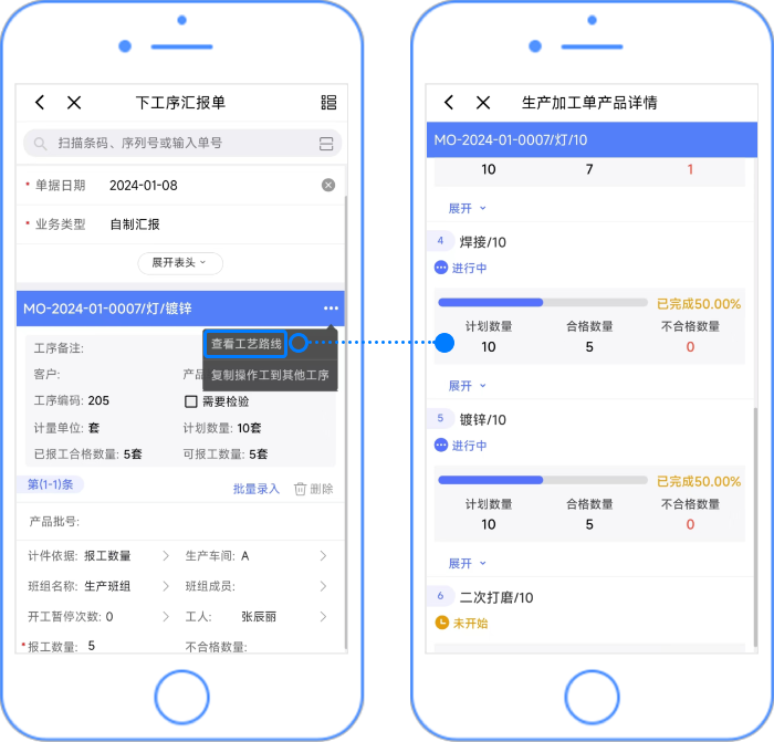 在工序汇报时,快捷查询汇报工序所在的加工单工艺路线,核对各序工序的执行情况。