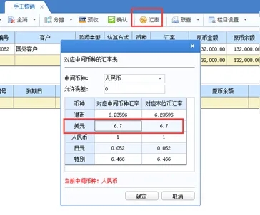 Ø 关于【汇率】设置方面:注意一定要维护手工核销界面的【汇率】,如果不点击【汇率】维护信息,则手工核销界面无法正常计算销售发票的结算金额;其中“对应中间币种汇率”和“对应本位币汇率”一般按当期的汇率维护。