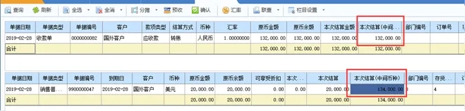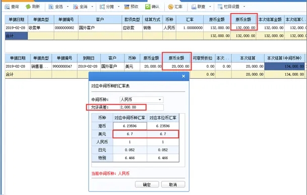 b) 录入发票的结算金额20000,系统自动计算出本次结算(中间币种)134000. 点击确认,异币种核销完毕。
