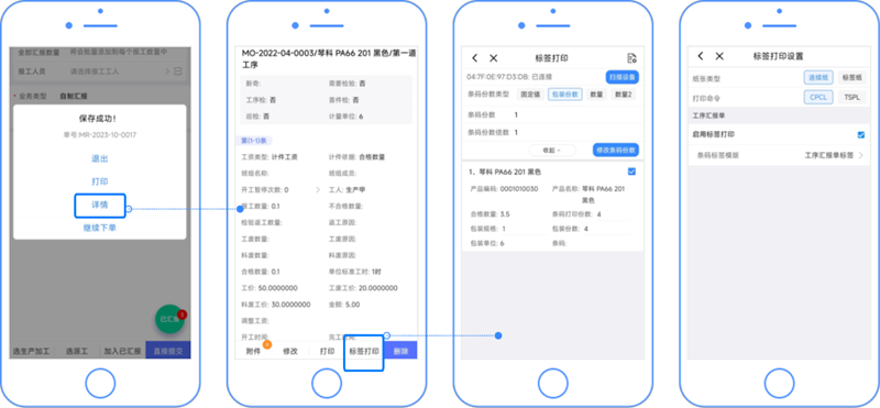 工序汇报完成后,基于汇报数据或汇报产品信息打印标签。