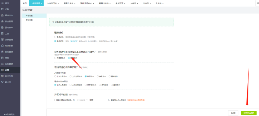 【设置】/【基础设置】-【库存选项】模块新增手工记账功能,如删除、补录、修改单据后可点击手动记账,以便更快同步于智能凭证中心,重新计算成本生成凭证。