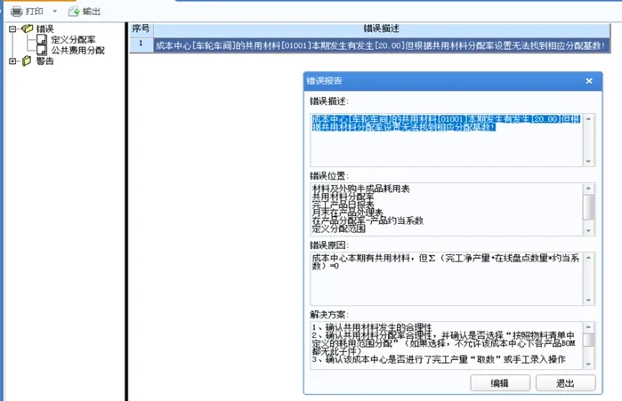 2. 成本中心[车轮车间]的共用材料[01001]本期发生有发生[20.00]但根据共用材料分配率设置无法找到相应分配基数!