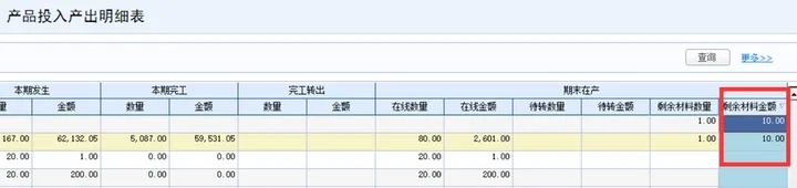 通过产品投入产出明细表确定剩余材料的存货编码(费用编码),期初材料剩余,查询上月生产材料领用核对,输入材料编码和材料类型,查出的记录双击关联到流水账,即可查出对应的单据;期末材料剩余,则查询本月的生产材料领用核对。