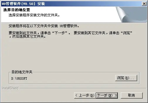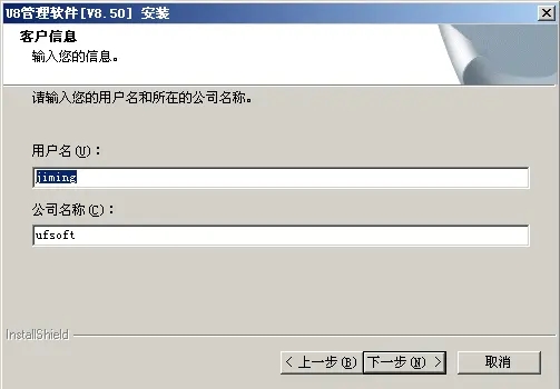 图1-3 U8管理软件安装-客户信息界面(4)输入用户名和公司名称,用户名默认为本机的机器名,单击【下一步】进入“选择目的地位置”界面,如图1-4所示。