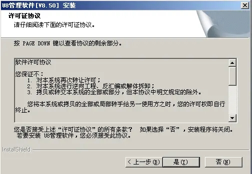 图1-2 U8管理软件安装-许可证协议界面(3)单击【是】,接受协议内容进入“客户信息确认”界面,如图1-3所示。