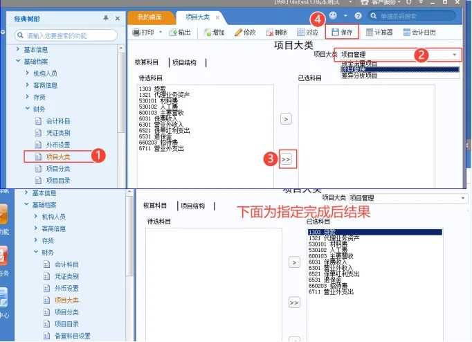 2,对已勾选项目核算的科目 指定到同一个项目大类下