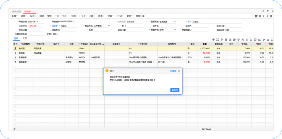 2)系统会按照客户+存货维度,记录历史换货借/换货还数量,超量还货时,会给出提示