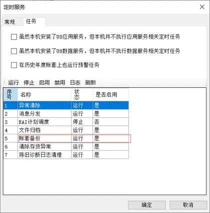 2.2 检查定时服务中的账套备份是否启动,启动后需过几分钟后重新进入检查是否会自动停止,如果停止需安装aa和fs结尾相关补丁