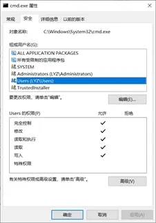 Cmd权限设置,右键点击cmd,点击属性点击安全进行设置,users、system、administrator都需要设置