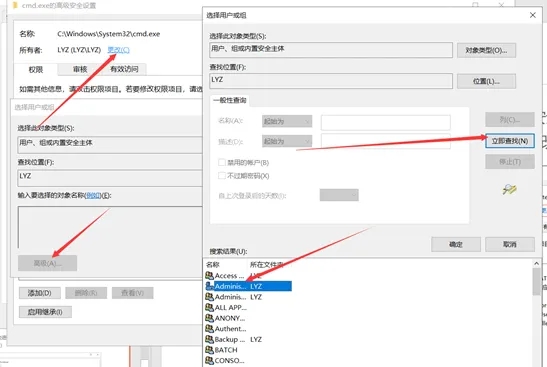 其次,如与无法更改权限情况,点击高级-所有者(更改)-高级-立即查找,将所有者设置为administrator或user在进行更改权限