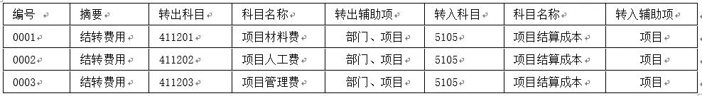 问题背景:以结转项目成本费用为例,其中433201,433202,433203费用科目,结转到5105结算成本科目,则433201--433203必须具有相同的辅助核算,结转格式为: