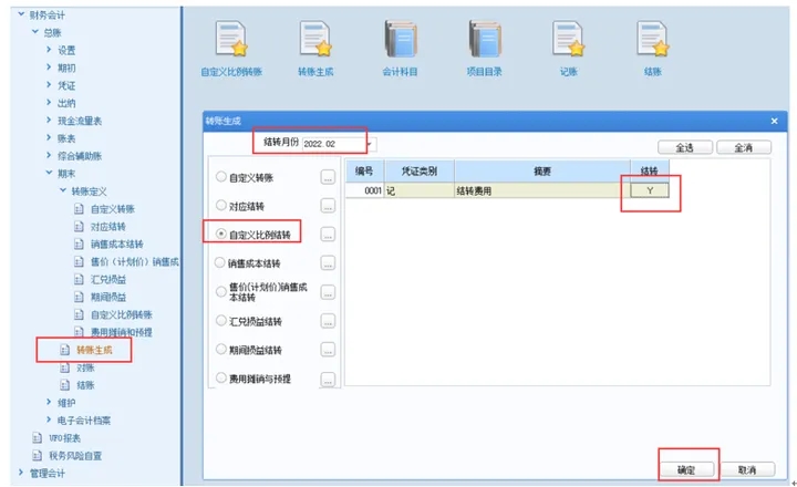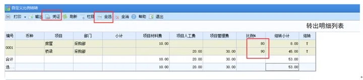 注:自定义比例结转无法包含未记账凭证,因此要把转入科目相关的凭证都审核记账,才可以进行结转。