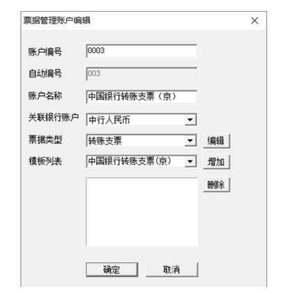 输入账户名、关联银行账户(可选所有未停用的银行账户)、选择票据类型(现金支票、转账支票、银行进账单等)、模板列表(下拉选择支票或票据,然后再选择地区-银行),然后点击确定即可设置完毕