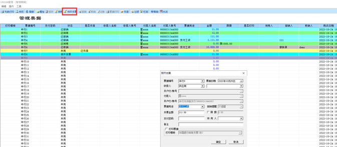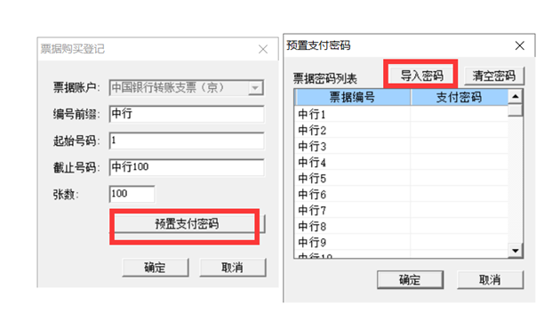 即是将购买的相应开户行的票据(如中行转账支票)录入到软件中去的过程;主要是输入编号前缀、起始号码、张数,且可以将每张票据的密码预先输入系统(点击预置支付密码,即可录入每张票据的支付密码,也可以导入密码),以方便后续领用