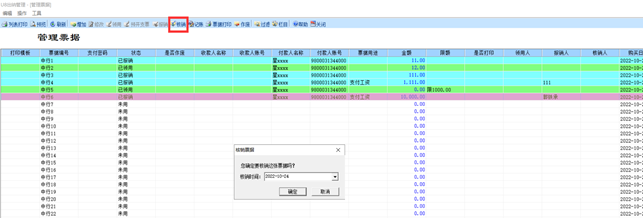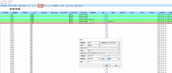 1.点击核销票据,弹出票据核销选项, 选择条件后,点击确定相应状态的票据状态更改为“已核销”。