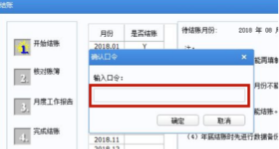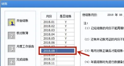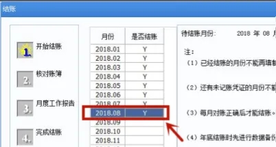 1. 输入密码口令后,2018年8月份对应的“Y”消失,表示反结账成功,点击“取消”,退出结账窗口。