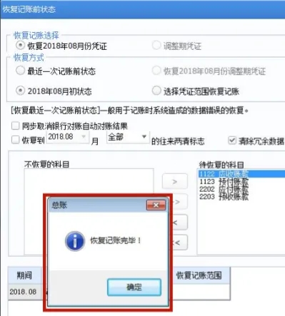 1. 确定后提示“恢复记账完毕”,点击“确定”。这样是对2018年8月份凭证取消了审核,取消审核后可以对账务进行修改。