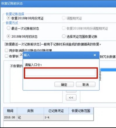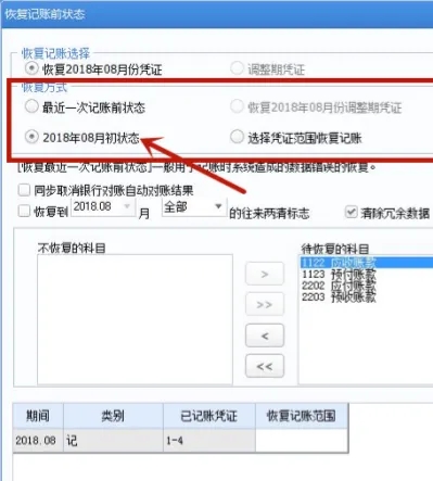 1. 在“恢复记账前状态”窗口中,“恢复方式”选项中选择“恢复2018年08月初状态”,点击“确定”。