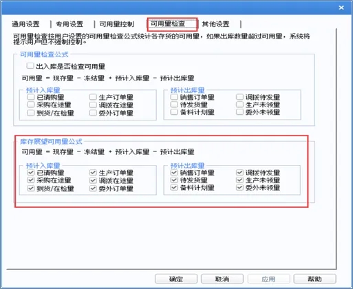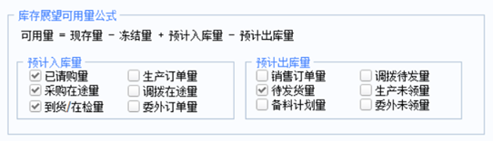 (2)库存管理—设置—选项—库存展望可用量公式中勾选对应的状态,否则不显示数据。