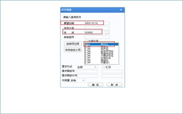 (2)选择存货和仓库查询库存展望,查询条件中,展望日期填写大一些,避免单据日期在展望日期之后而无法查询数据;