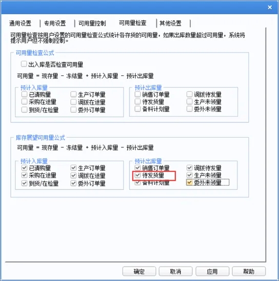 (1)在库存管理——设置——选项,库存展望可用量公式中勾选待发货量;