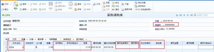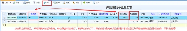 将60号请购单一并选中做比价后,也能取到价格表中最低进价的供应商、单价及税率了。