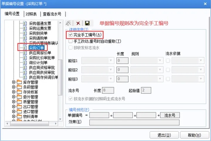 将单据编号规则改为完全手工编号后,再去请购单批量订货界面选择请购单生单时会提示“订单编号不能为空”,导致生成采购订单失败。