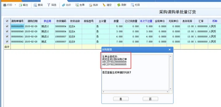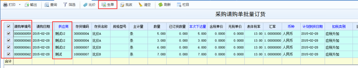 采购请购单批量订货界面选中的相同供应商的请购记录会生成在同一张采购订单上,不同供应商的请购记录会分开生成不同采购订单;