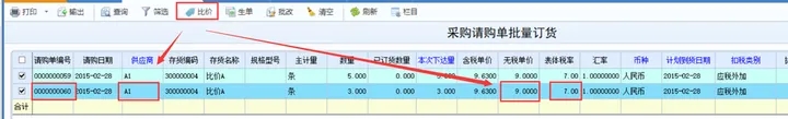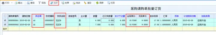 此时在采购请购单批量订货界面对存货比价B的请购单做比价,比价后,系统自动带出的是供应商A1,无税单价是9,因此得出系统是根据无税单价来比较的,比价时取无税单价更低的供应商和价格。