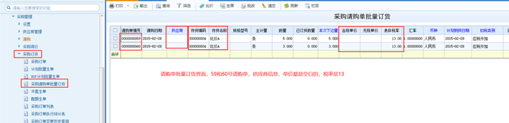 进入请购单批量订货界面,此时请购单的供应商信息及单价都是空白的