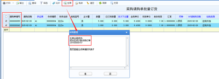 4、 请购单批量订货界面点击生单按钮生成采购订单。