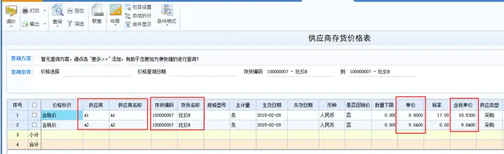 如图,供应商存货价格表中存货比价B有两条价格记录,价格标识是含税价,一条是供应商A1,无税单价9,含税单价10.53,一条是供应商A2,无税单价9.04,含税单价9.04,供应商A1的无税单价9小于A2无税单价9.04,但是供应商A1的含税单价10.53大于A2的含税单价9.04;