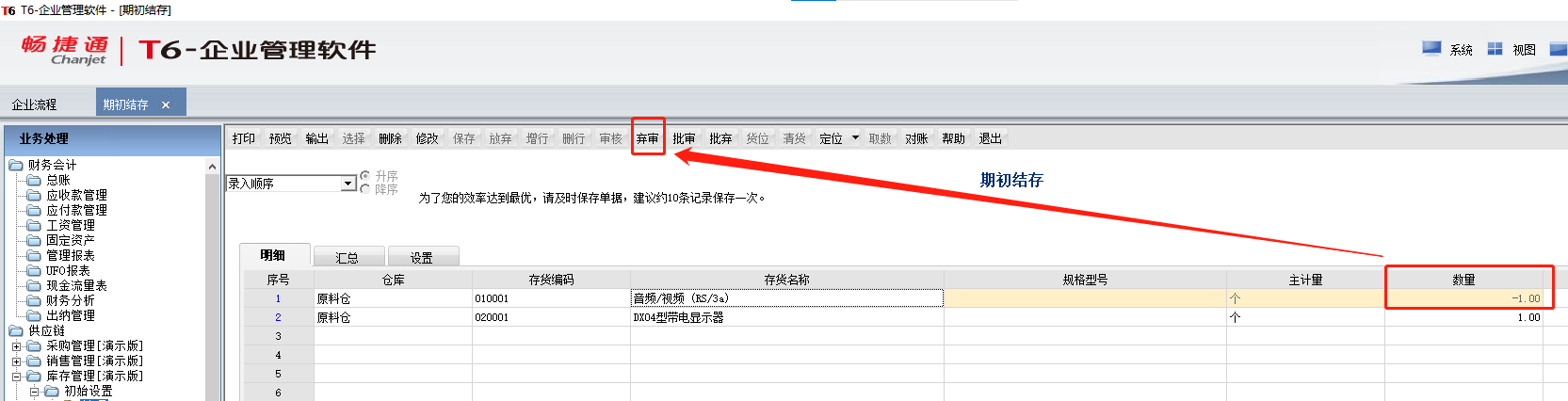 没有在【库存管理】模块勾选【允许超可用量出库】,所以在审核时只有确定按钮,勾选了允许超可用量出库即可审核为负数的期初结存存货。
