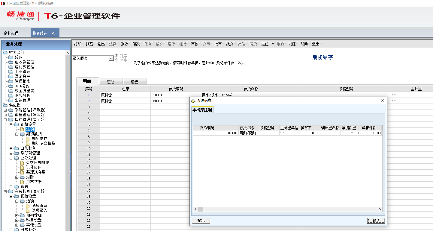录入了库存期初结存为负数的存货,但是没有办法审核,点击了审核没有反应,会弹出零出库控制弹框,点击【确定】之后依旧是未审核的状态。