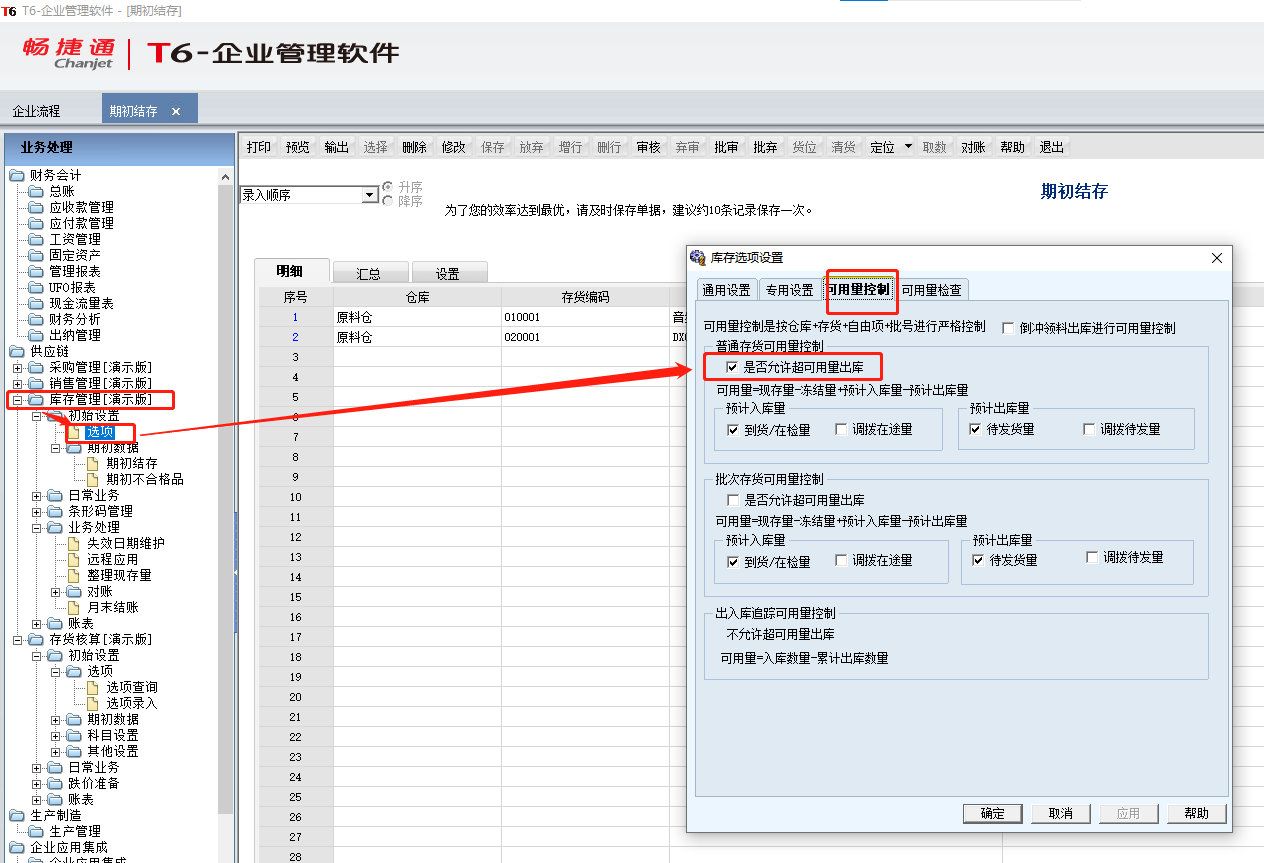 1.点击【库存管理】-【期初设置】-【选项】,点击【可用量控制】页签,勾选【是否允许超可用量出库】。