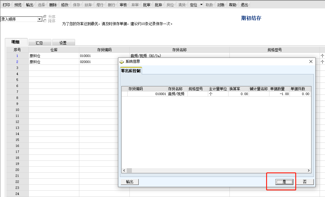 2.勾选了是否允许超可用量出库之后,再去审核为负数的期初结存的记录,在弹出的零出库控制页面提示框时,点击【是】即可完成审核。