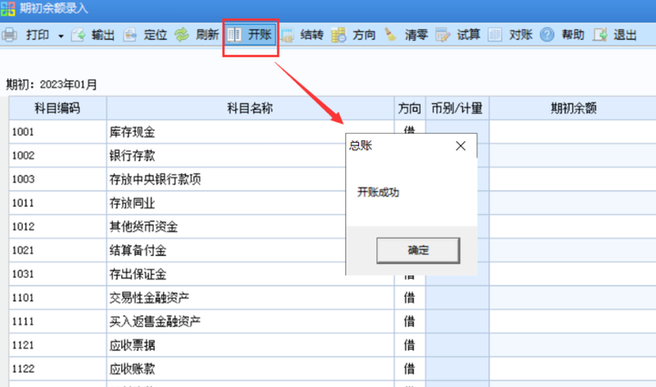 进入总账-期初-期初余额界面,点击“开账”按钮,将上年科目体系结转到本年。