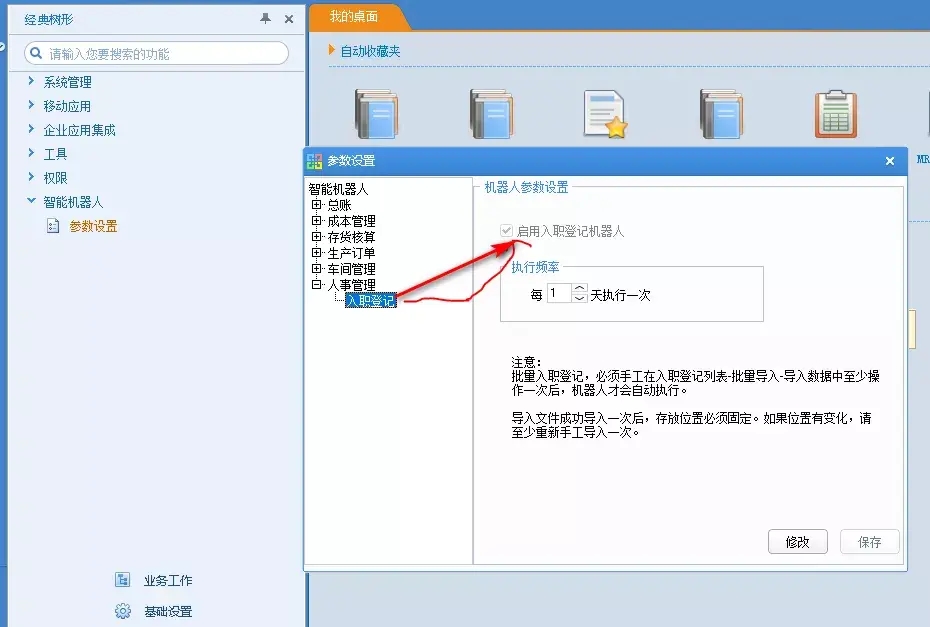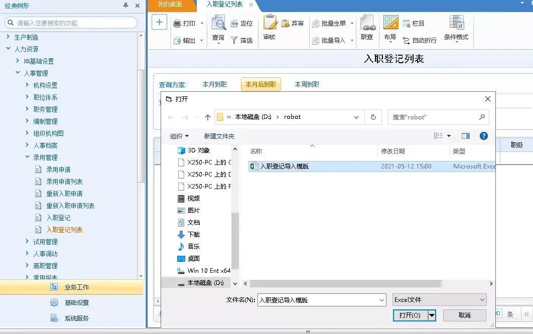 注意事项: 批里入职登记:必须手工在入职登记列表-批里导入-导入数据中至少操作―次后,机器人才会自动执行。 导入文件成功导入一次后,存放位置必须固定。如果位置有变化,请至少重新手工导入一次。
