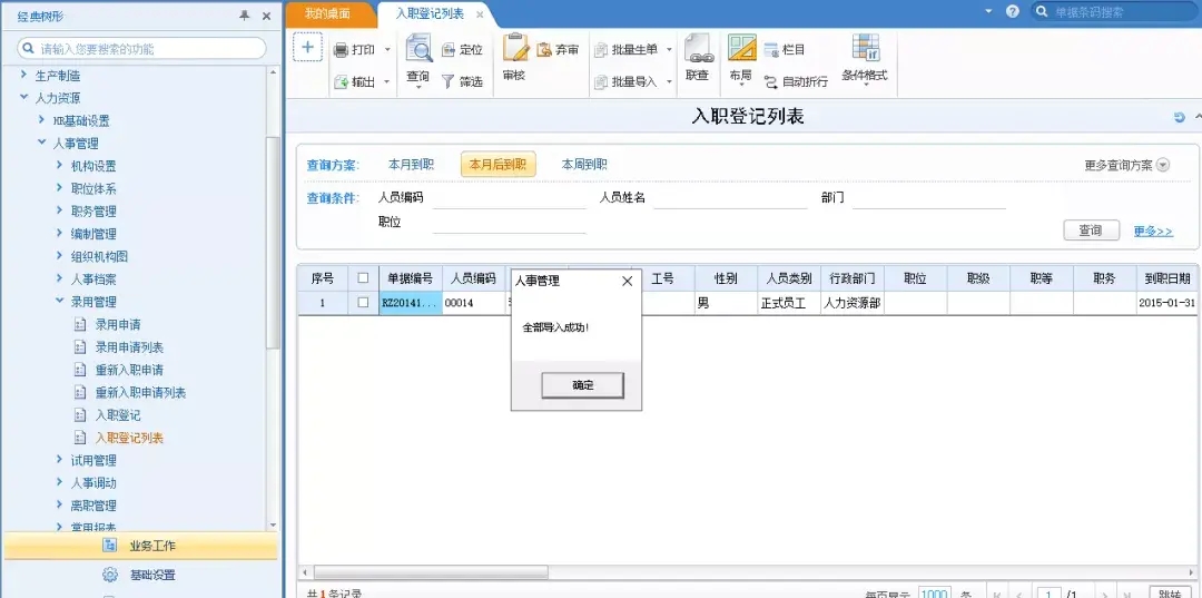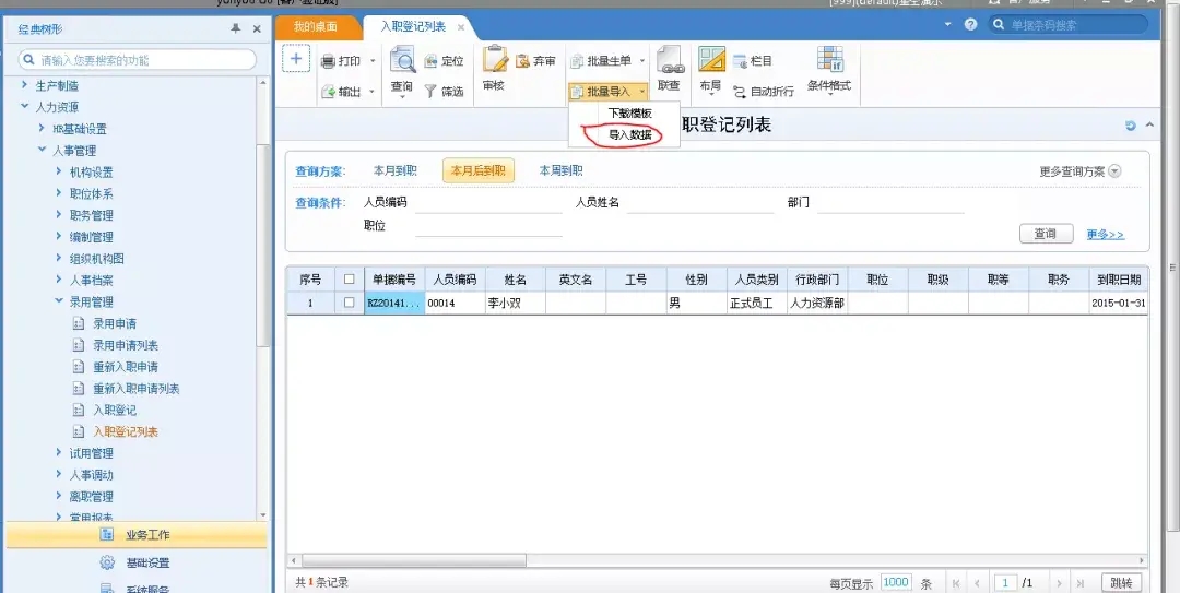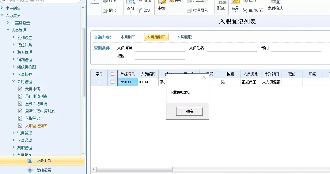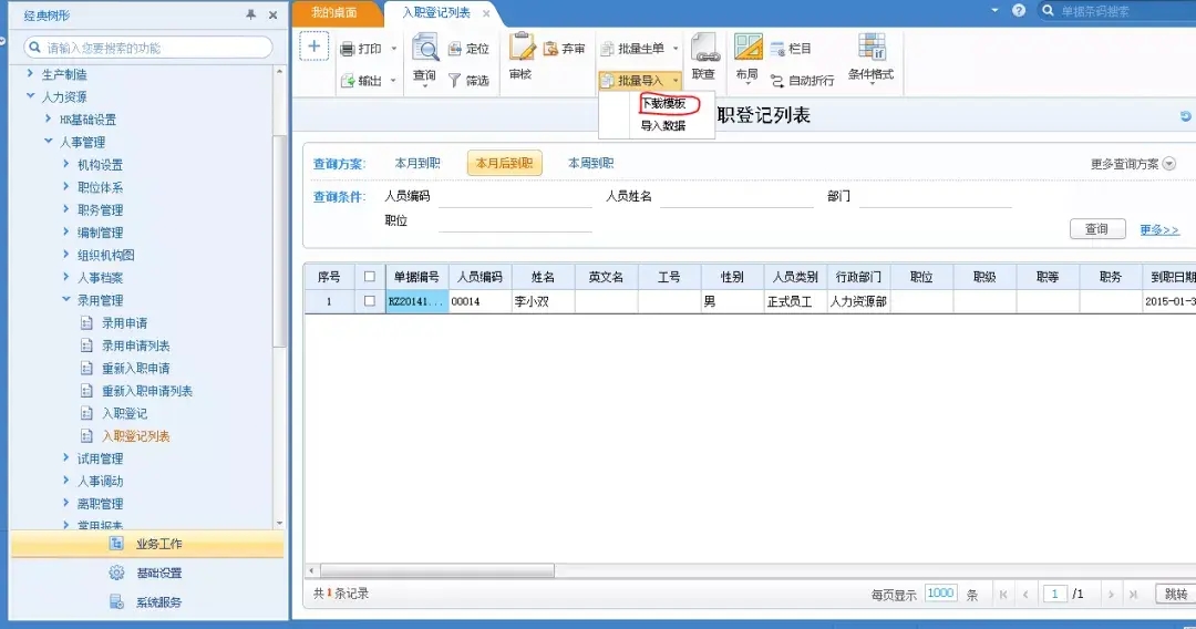 1、下载模板 进入入职登记列表,选择批量导入-下载模板