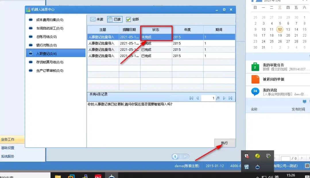 如果点否,后续可以在机器人消息界面选择未完成状态的记录,直接点“执行”按钮手工运行机器人